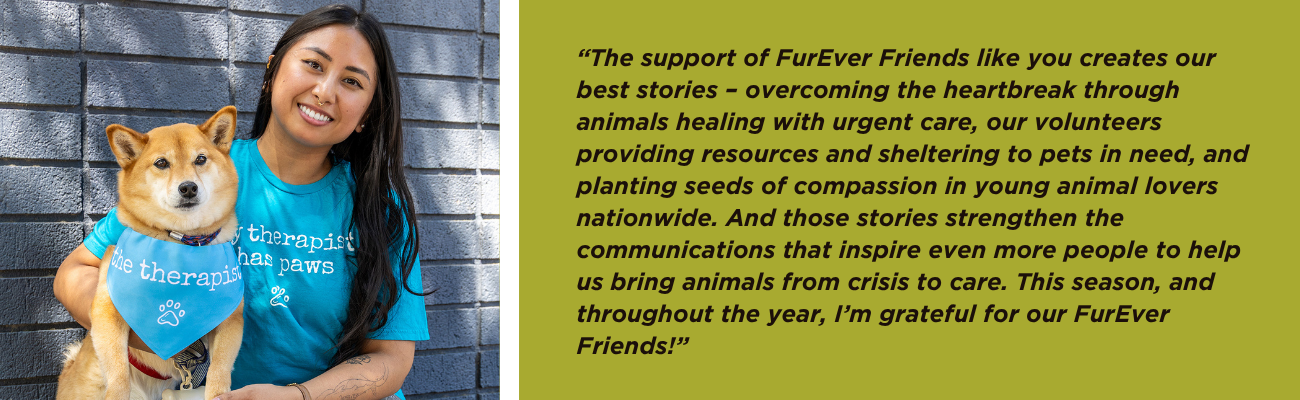 When things get hectic and we need a reminder of our “why,” we think not only of the pets and families we’re helping but of your inspiring commitment to helping them, too. Johanna Casao, mother of Shiba Inus and our Communications Manager, captured the spirit of our gratitude best.Â